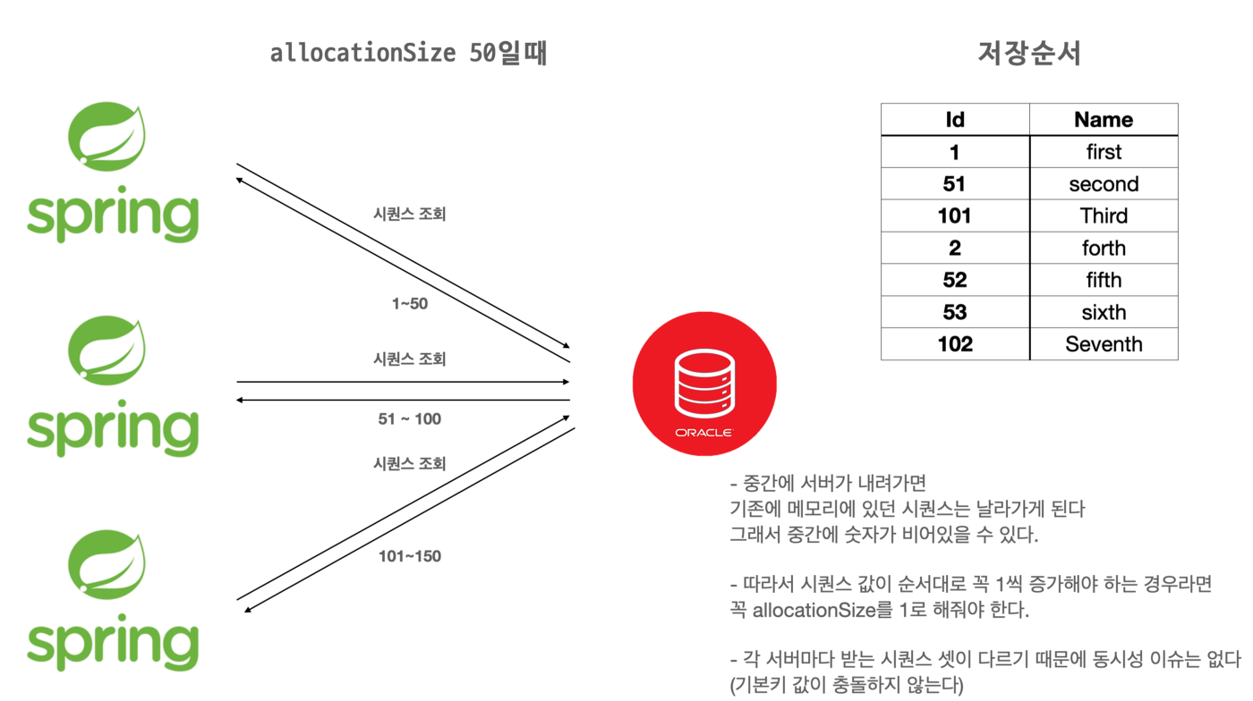 allocationSize값이 50이면 시퀀스를 한번에 50을 증가시킨 다음에 1~50까지는 메모리에 할당한다. 그리고 51이 되면 시퀀스 값을 100으로 증가시킨 다음 51~100까지 메모리에 식별자를 할당한다.
