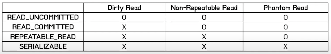 - SERIALIZABLE: 한 트랜잭션에서 사용하는 데이터를 다른 트랜잭션에서 접근 불가